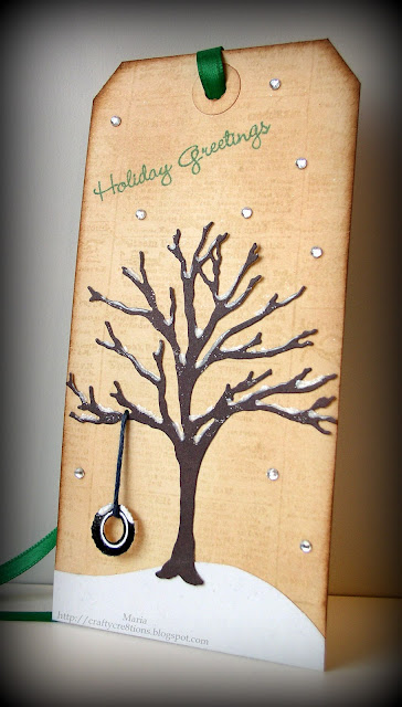 For the tag background, I used my IO newspaper print stamp with Distress Inks. Then adhered the IO tree die cut. I wanted the tire swing to be popped up, so I threaded some thread through the tag and looped it around the popped up tire. For the snowy effect - I used liquid pearls on the tree and sprinkled glitter while it was wet. Then added more bling :)